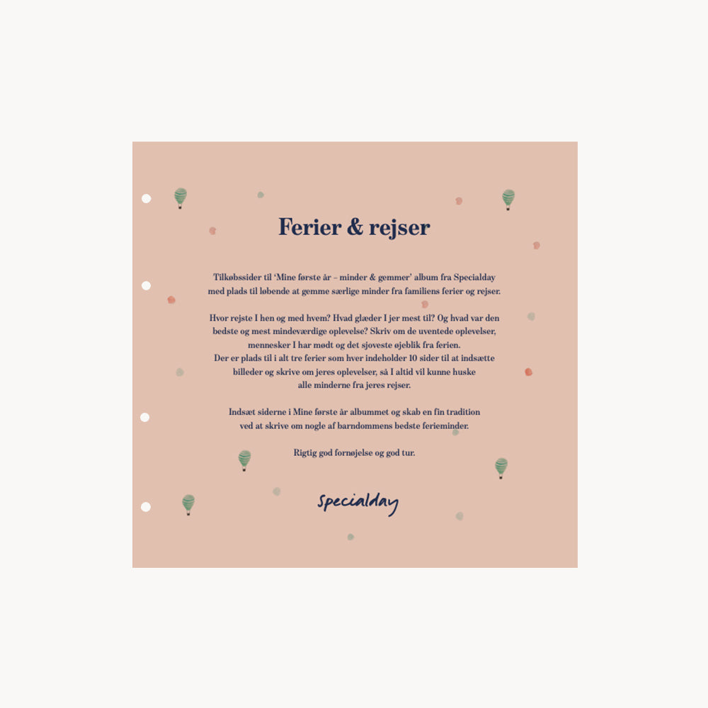 Tilkøbssider til Mine første år – album fra Specialday med plads til løbende at gemme særlige minder fra familiens ferier og rejser.