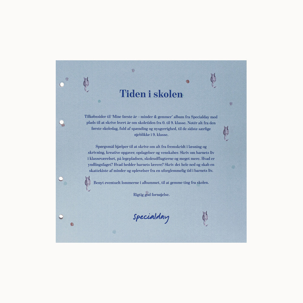 Tilkøbssider til Mine første år – album fra Specialday med plads til at skrive hvert år om skoletiden fra 0. til 9. klasse. Notér alt fra den første skoledag, fuld af spænding og nysgerrighed, til de sidste særlige øjeblikke i 9. klasse.