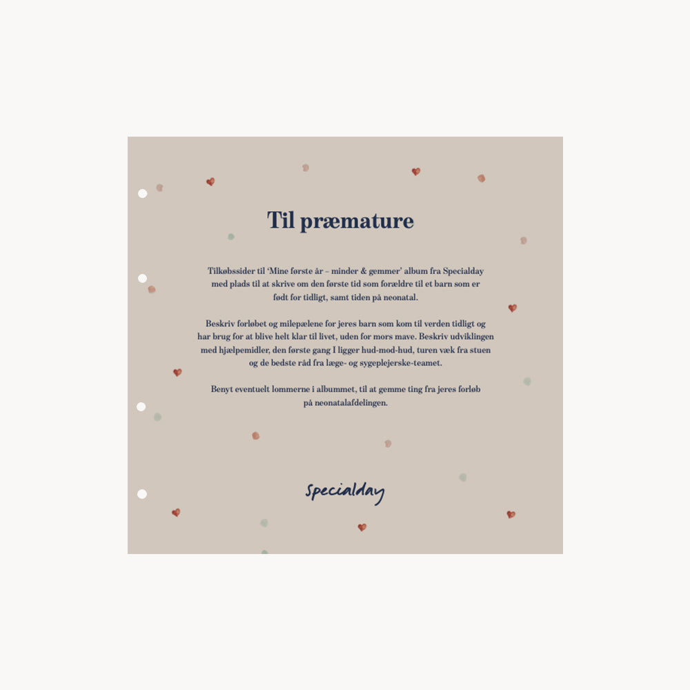 Tilkøbssider til Mine første år – album fra Specialday med plads til at skrive om den første tid som forældre til et barn som er født for tidligt, samt tiden på neonatal.