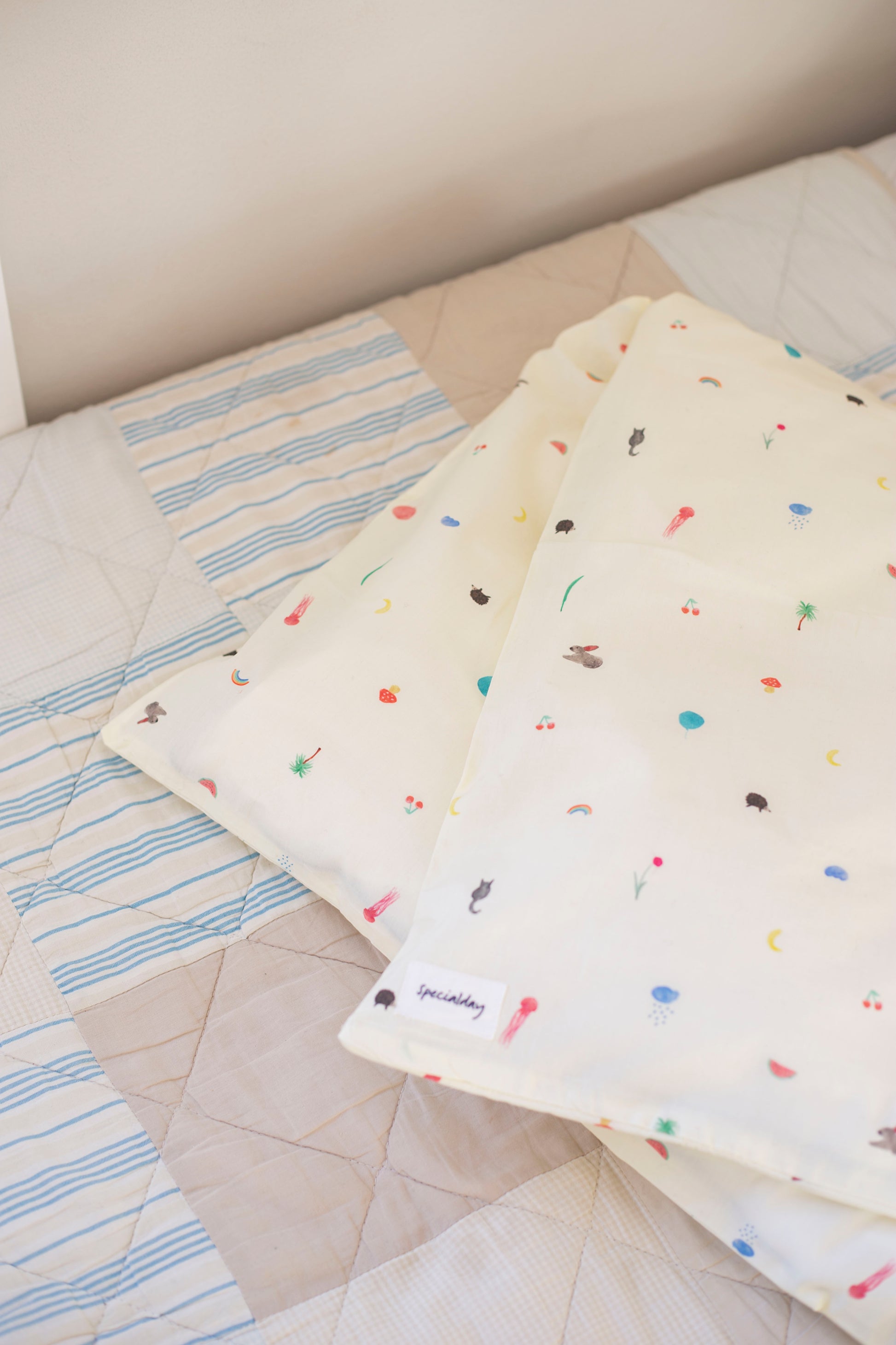 Soft baby duvet and pillow case in string bag. The duvet has a hidden zipper closure and the pillow case has an envelope closure.