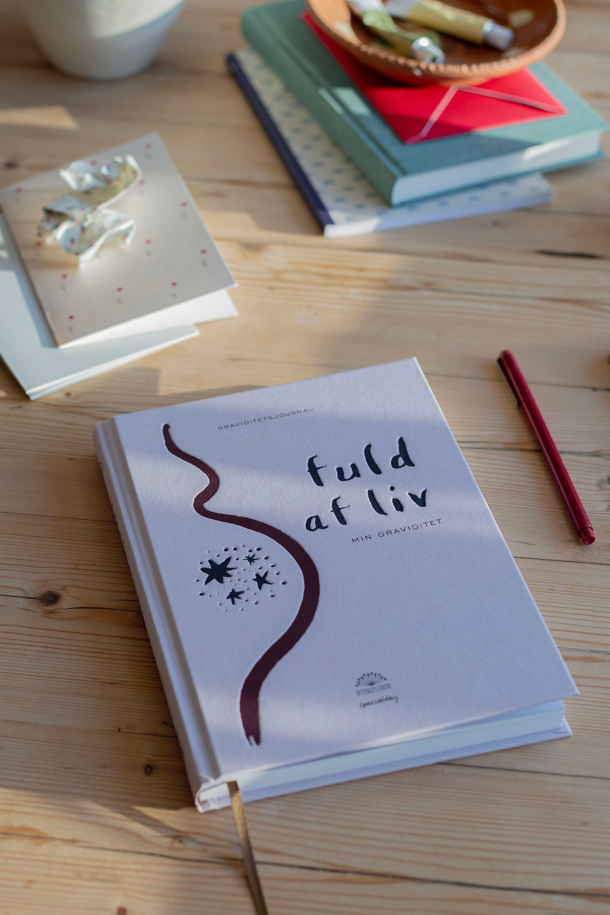 Bogen Fuld af liv – min graviditet er en udfyld-selv bog, en graviditetsjournal, hvor du som gravid kan samle dine tanker og skrive ned, hvordan du har det. Om lidt, når du står med din baby i armene, kan dagene flyde sammen. Så er det dejligt at have konkrete noter at se tilbage på – og ord, der kan vække minder om en helt særlig tid til live.