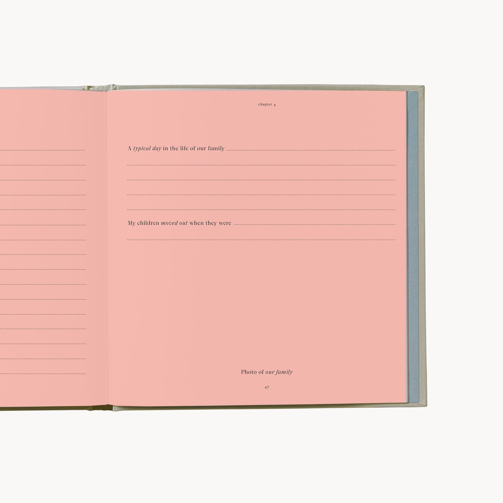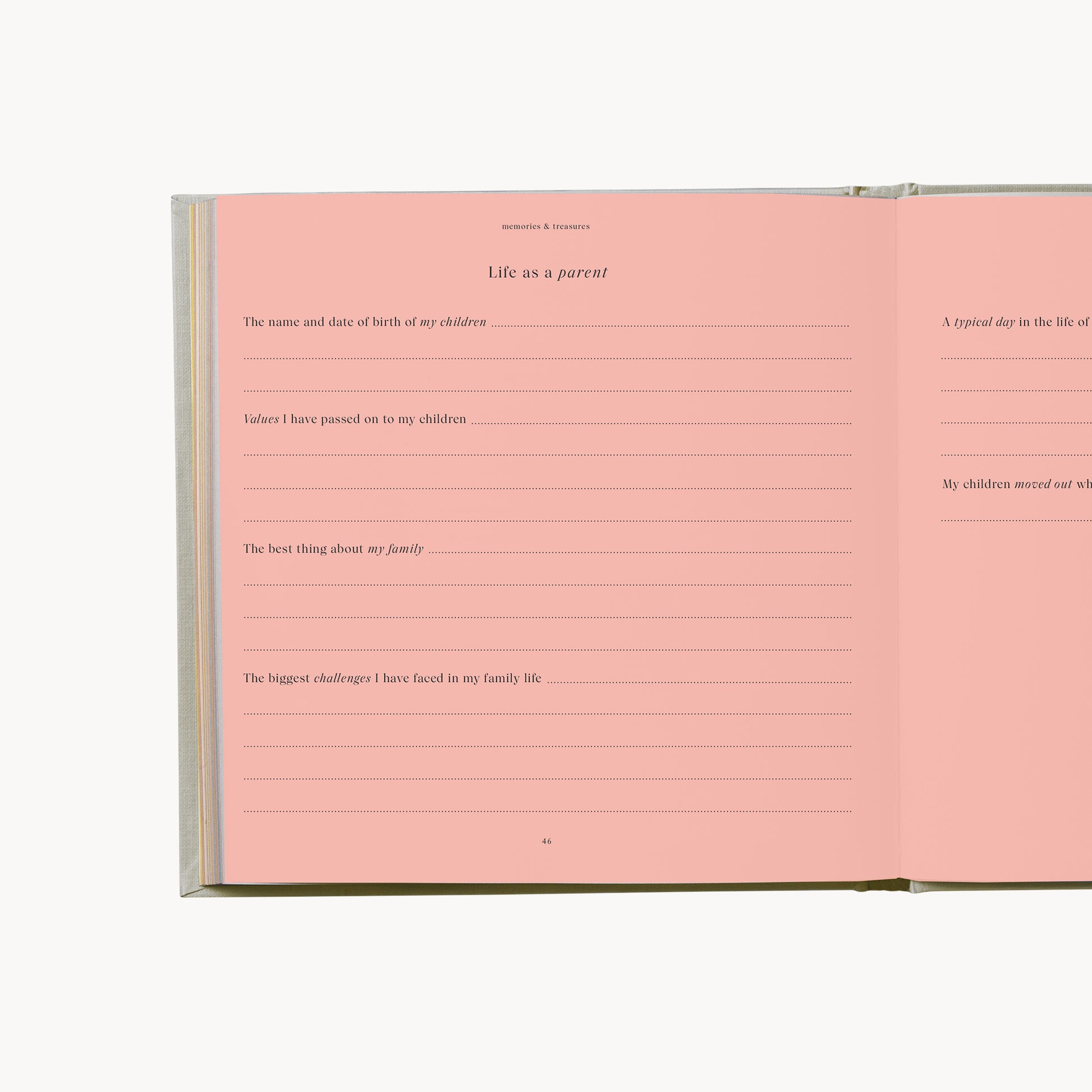 - Dedicated sections to write about parents, grandparents, and other important relationships.