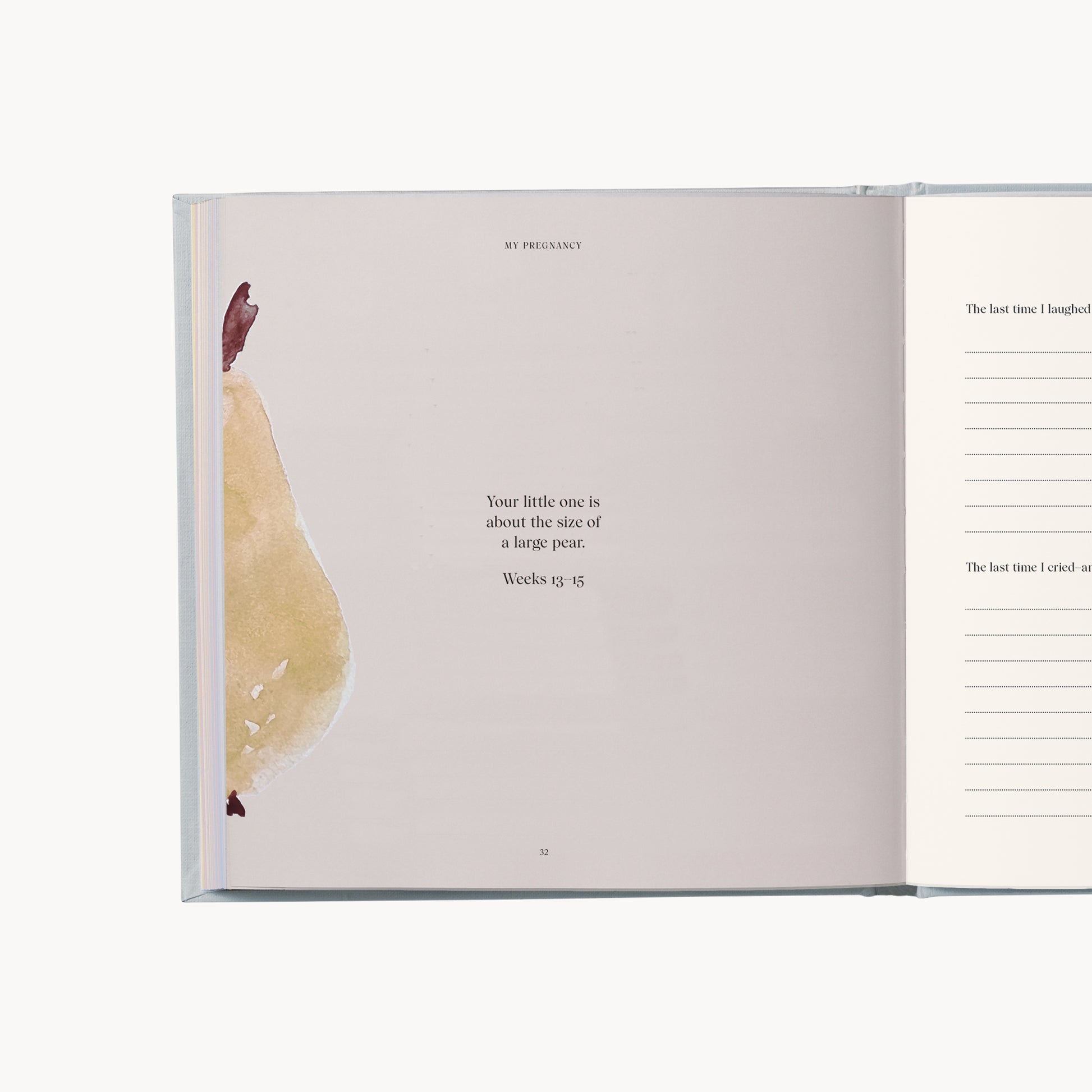 • Thoughtful questions encourage you to reflect on and document everything—from the first signs of life and changes in your body to your thoughts about birth.